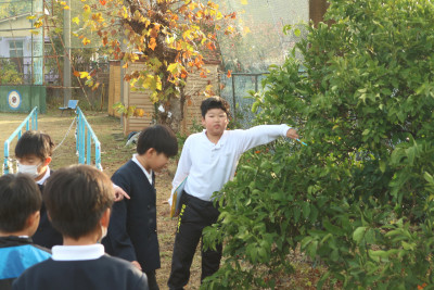 児童たちは、校内にあるみかんの木の収穫時期や、収穫後のみかんの木の世話の仕方、どんなみかんがおいしいかなどについて質問し、答えていただきました。収穫後は、肥料を与えたり、剪定する必要があることなどを学びました。
